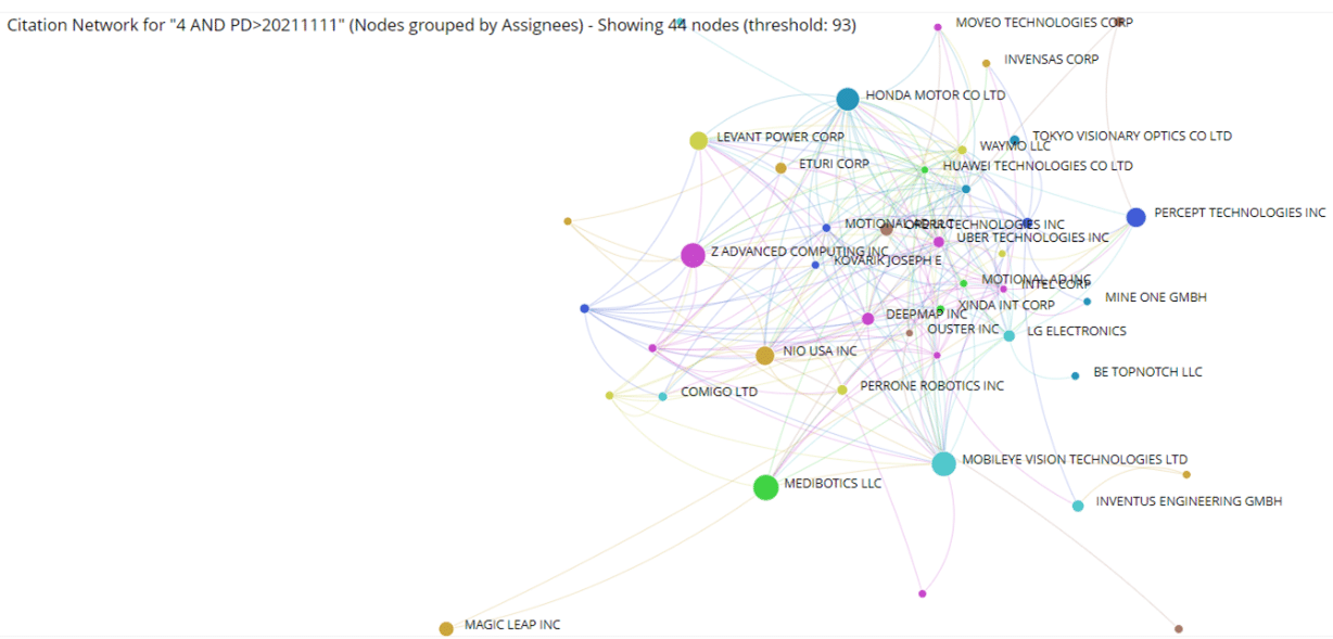 An essential element of Innovation Intelligence is learning about competitors, assessing their strategies, and having a broader picture of the key players in your market. Analysing patent citations allows organisations to quickly identify players working in a similar technology area or new competitors entering a similar field. You can identify the most influential players in your results using the citation networks shown below. This allows you to instantly assess your competition and formulate your strategy.