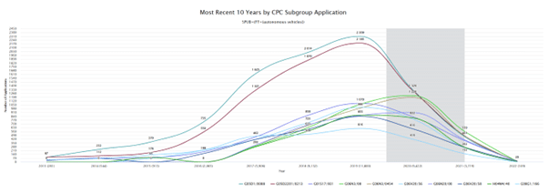 Shown below are the top 10 CPC groups over the last 10 years for ‘Autonomous Vehicles’. You can see the top technology groups for granted patents by year. It’s easy to spot straight away that G05D1/0088 (related to traffic control systems for road vehicles) and G05D2201/0213 (which relates to the Control of position, course or altitude of road vehicles and trucks) are the fastest growing areas.